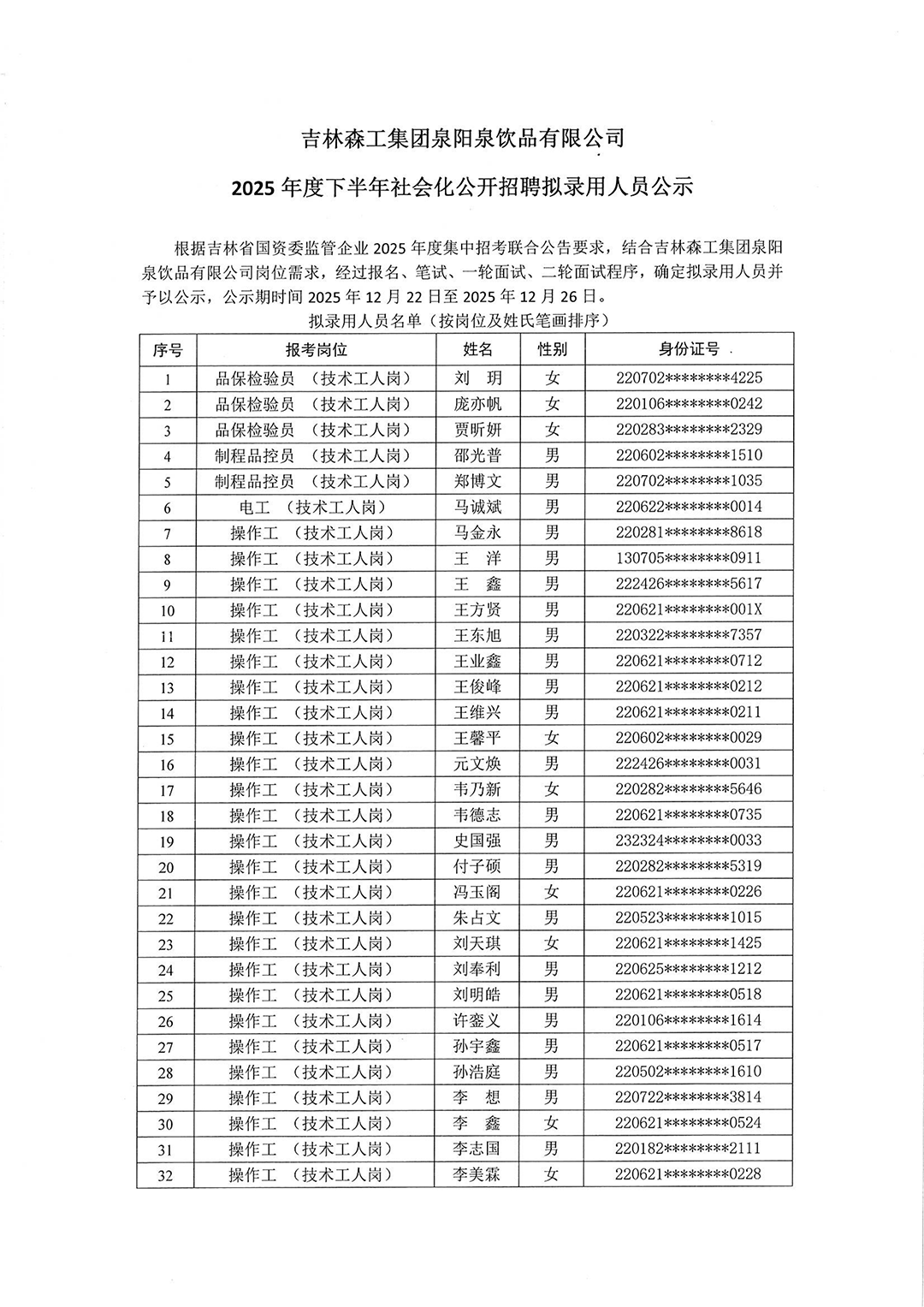 吉林森工集團(tuán)泉陽泉飲品有限公司2025年度下半年社會(huì)化公開招聘擬錄用人員公示